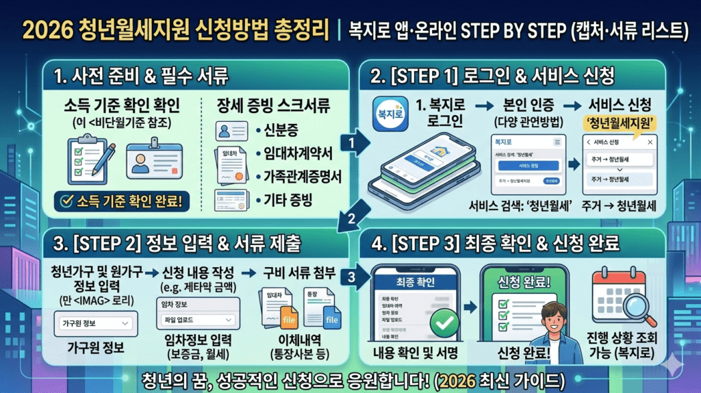 - 2026 청년월세지원 신청방법 총정리|복지로 앱·온라인 STEP BY STEP (캡처·서류 리스트)이거 놓치면 480만원 날립니다 솔직히 말해서… 서류 하나 잘못 제출하면 탈락입니다 😥근데 반대로, 제대로만 준비하면 월 20만원 × 최대 24개월… 자세히 보기: 2026 청년월세지원 신청방법 총정리|복지로 앱·온라인 STEP BY STEP (캡처·서류 리스트)
