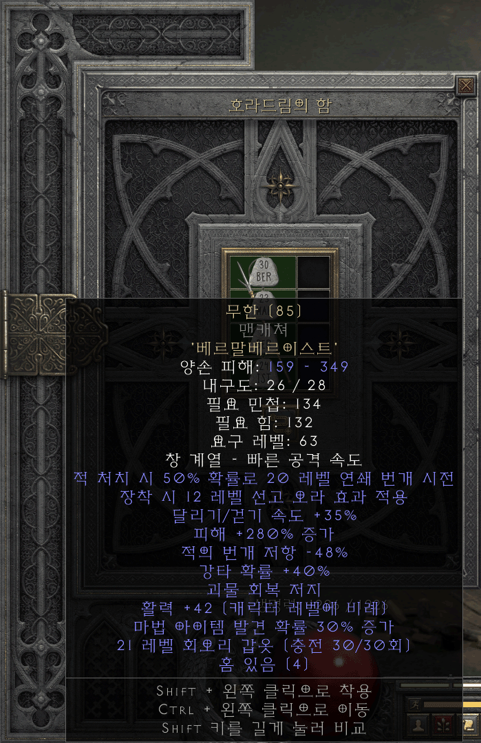 디아블로2 라스마 육성하면서 제일 필요한 아이템은 맨캐쳐 무공(무한) 룬워드 스피어였는데, 드디어 구했습니다.